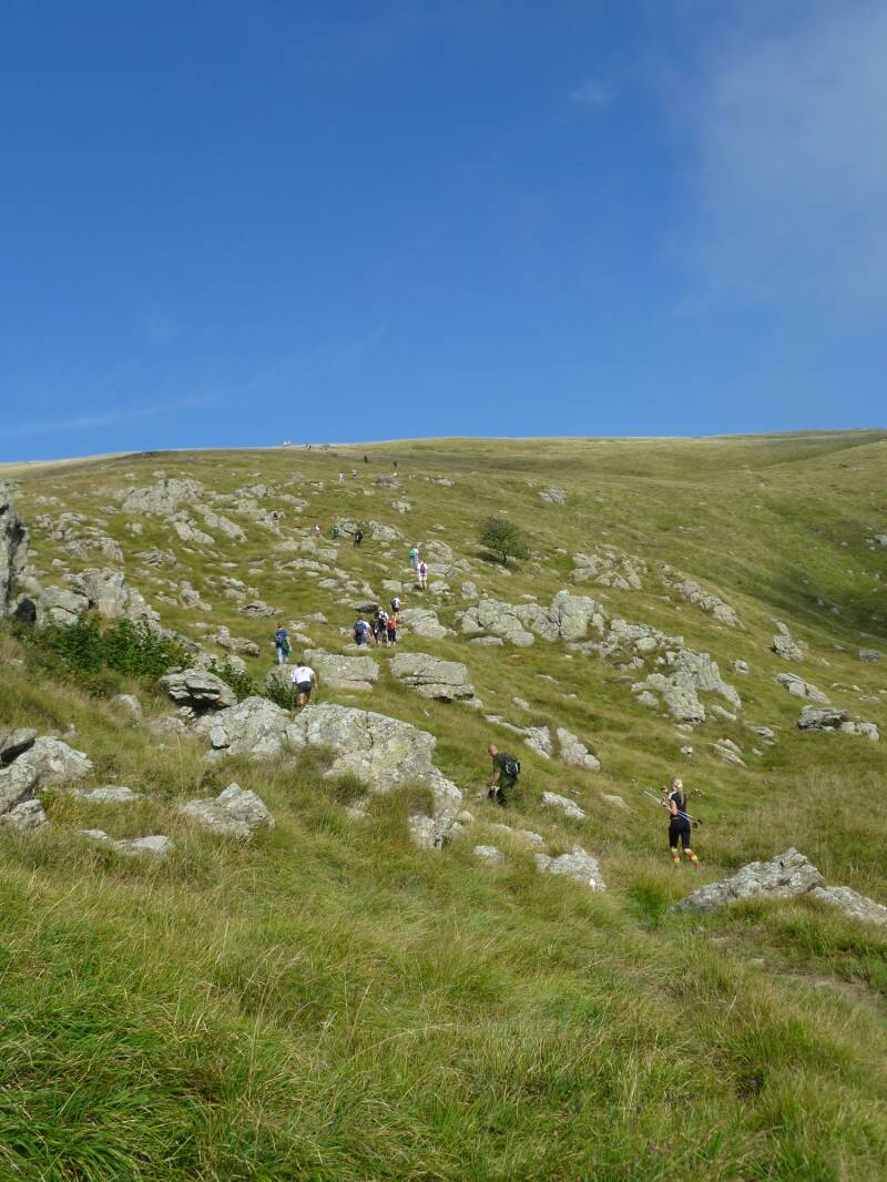 And then there you are, at the bottom of a slope. I estimate we are to climb about 500 meter in barely two kilometer distance. The hikers who have already gathered their courage are barely more than little specks between the rocks. The early ultra runners are already returning when I take my first footsteps on the loop. Immediately I know this is going to take awhile. In the distance we hear heavy bells, in the depths we see cows grazing and for a moment I imagine myself to be in Switzerland. Regularly I have to take a short break to give my thumping heart a break. Still people are coming up running. I don’t get how they’re able to do so. I figure out I’m going about 2,5 km/hour and that ‘s fine by me.