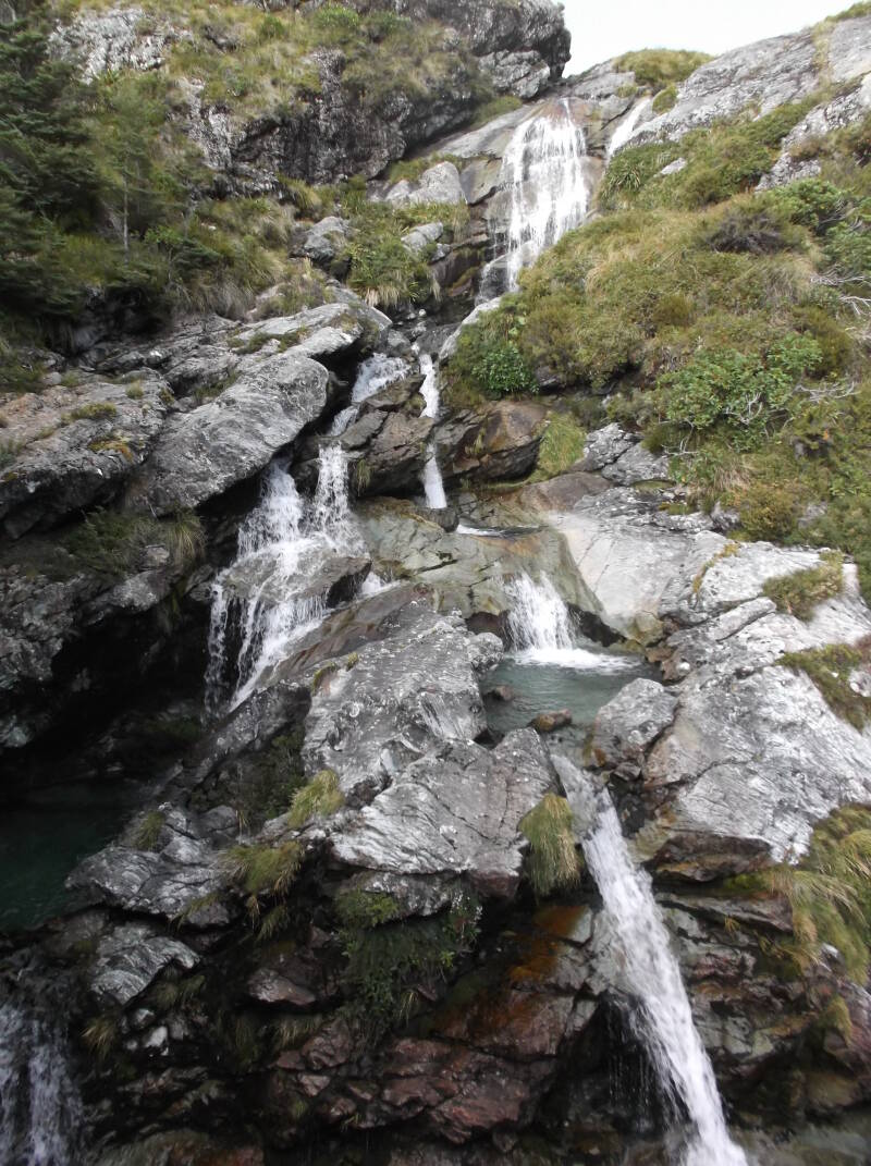 You don't get away easily from Routeburn Falls hut. First there is the view from the veranda of awakening mountains, the peaks still covered by clouds. Then, once packed and ready, you step onto the trail. Five meters from the front door you come above the tree line and the trail stops being easy. Climbing across rocks, past the hut for groups with a guide and the helipad. And finally, of course, there is that waterfall, the Routeburn Falls, which actually consists of two adjacent waterfalls. The one coarse and tough, a thin layer of water flowing across chunky rocks. The other a steady stream of water tumbling across the rocks from an unseen distance into a crystal-clear pool and throwing itself off the next rock. This is a wonderful start to the day. I continue climbing on my way to Lake Harris and Harris Saddle, both named after Otago's then superintendent, John Hyde Harris. A lack of creativity or a way to curry favor with the boss? Every now and then I notice the stones crunching under my mountain boots or lying half buried in the earth, waiting for me to clamber over them. Several are green and I secretly wonder if this is the jade, or pounamu in Maori, that makes this path exist. Since most of the jade was found on the west coast, this trail was the way from the inland villages at Lake Whakatipu and the Hollyford valley. The Europeans explored the route as early as 1860, but it got no further than tourists who were taken to the Routeburn Flats by horse and from there on foot to Harris Saddle from 1880. The trail as it stands today was started in 1909, but after the First World War it was not picked up again until 1960 and finally completed. A few climbs further, I look out over the next valley, a mosaic of gray stone and reddish brown grass that glows warmly in the sun, surrounded by awe-inspiring mountains. Not even because they are so high, but it is so wonderfully different from the flat Netherlands. The clouds are low and it’s cold. For the first time I am wearing everything, hiking shirt, sweater, jacket. Even the thin sports gloves that I never thought I would need. After a few hundred meters I get warm and the jersey is taken off. When the sun comes out, the jacket and gloves follow. The trail winds nicely, but does not climb too seriously. Below me the stream is on its way to the waterfalls I so admired an hour ago. Apart from the grass, there is not much green to be seen at this altitude. A few succulents, some careful yellow flowers, short mosses. Looking back in the direction of Routeburn Falls, the brook lights up in the morning sun as if the Milky Way has come to take a look on Earth. We pass a small building with a folding tent next to it. As a hiker you’re not allowed to camp here, but this is probably someone who belongs here. A little further on we are warned about the bad condition of the trail, although I see no difference with what we have had to put up with so far. A man is hacking into a rock with a chisel. It is not entirely clear to me how this should improve the trail, but I thank him for his work anyway, because the trail looks fine. After a gravel-filled wooden staircase I come across a wheelbarrow with tools next to the trail. How on earth did they get it here? A lake, Lake Harris, appears around the corner of a mountain. Small and elongated, enclosed by the stern rocks and with snowy peaks in the background. I hike along the lake until I reach Harris Shelter, a simple shelter where you can only stay overnight in emergencies. Here it is busy with hikers from both directions. I put my backpack in a corner, pack my water and my camera in a small backpack and then start the climb to Conical Hill, a viewpoint at 1,515 meters. This path is only 250 meters according to my Trailblazer guidebook, but it feels a lot longer. It’s not a path suitable for fast hiking. The start goes well enough and although the path rises considerably, I can move adequately with my trekking poles as support. But then there are also the parts where you have to scramble across the rocks, puzzle where you can put your feet without falling. A Frenchman descending assures me that the view is worth it and you can even see the Tasman Sea. I cover the last few meters with new energy. Then I'm at the top and the view is everything the Frenchman promised and more. I am looking for a place behind a rock to get out of the wind and quietly enjoy myself. I'm lucky. The clouds hold their breath for a moment and the view is beautiful. A whole chain of raw peaks and in the distance something that could be sea. I rarely have a fear of heights, but I still get a sick feeling in my stomach, while the land is sinking below me. It doesn't even descend very steeply, but the mountain continues into the valley. The wind ensures that I don't stay too long and on my way down, which certainly in the beginning hardly goes faster than on my way up it’s my turn to encourage and motivate the hikers. Soon I am back at the shelter, where a group has heated up more water than they need. Gratefully, I take a few cups for the noodles I've been carrying for a few days now. After this delicious lunch I continue on. The route continues to follow the valley and the silence is only occasionally interrupted by the sound of a small propeller plane taking a scenic flight or the helicopters supplying material for the trail's maintenance. Here and there are those large square plastic bags along the path, filled with gravel. I thought there were enough stones on the trail in the mountains naturally, but apparently that is not the case. There are also numerous stoat traps along the trail, some with an egg for bait. I wonder if the scent of so many people might scare off the predators, but when I meet a DOC employee who tends to the traps, it turns out not to be the case. Just like for humans, the trail is the easiest way to get around. Unfortunately he hasn't caught anything today. The trail becomes a lot greener, with a 