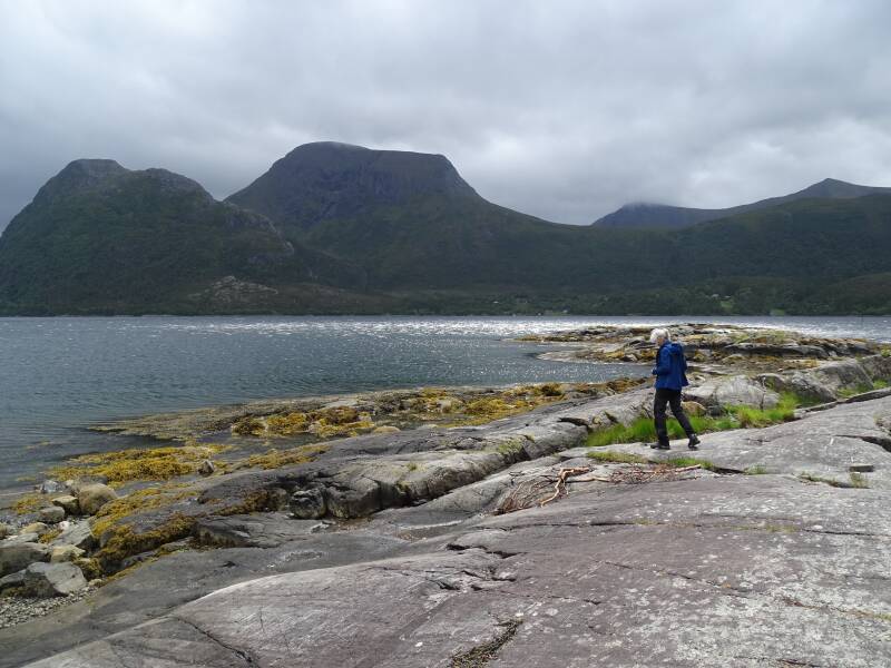 The morning starts mild and windless. From the hut we climb up over the flanks of the Pikfjellet. A green landscape without trees and shrubs, but with sheep in the distance. We walk a little too far, get off the route again and have to go back a bit. When I walk forward, the route suddenly turns right and I have to continue a bit higher. “It's easy to go wrong here,” I still think. A little later I see Ingrid walking straight ahead thoughtlessly over a rock some distance below me. Oops! Crossing is not possible in this swampy landscape, but fortunately she does not have to go back very far. We cross the saddle and on the other side we can climb again. Based on the map, I thought we would turn onto the peninsula and not see any more fjords, but in front of us there is an elongated stretch of water with a graceful arch bridge. We get higher, rocks, grass and water together form a beautiful coastline against the backdrop of merging mountains. There is even a bit of snow left on one of them. We hear plovers calling around us and when one comes close enough I see that it is a golden plover. A few marshes further, Ingrid startles a ptarmigan. The female runs in front of us and occasionally flies up a bit, how special. We ascend and descend, but not particularly crazy height differences. Then we come to a second mountain on a beautiful saddle full of lakes wedged between the gray rocks. It is breathtakingly beautiful. We follow the water over the rocks. Ingrid slips on a wet rock, a black, slimy spot that I had consciously avoided. Then we descend again through low bushes. The ground is very wet and we need a break, but we continue walking until we encounter dry ground near a pine forest. A bunch of Germans come towards us, with heavy backpacks and without trekking poles. Unexpectedly quickly they disappear from view again. Rested, we continue, ascending and descending over the hills. After a narrow path full of curved birches we arrive at a river that we carefully cross using stepping stones. Further than. We see a hut, hope it is ours, but we have to go another kilometer for that. My feet are starting to hurt, despite Ingrid's extra tape. A final edge then, a last stretch along a lake and the hut is suddenly very close. Delicious.