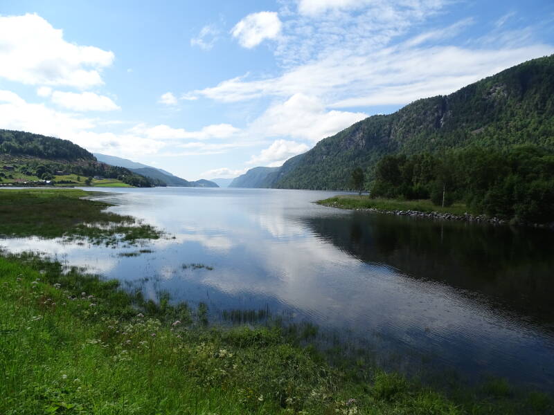 At a hill a bench has been made with stones and we rest for a while. Refreshed, we continue. Over the hill is a large lake in which a group of children are swimming. The sound of their laughter and screams carries far. We leave the children's party behind us and descend steeply through the forest. Here and there in the bushes we come across papers with the questions of a nature quiz for the children. After a last stretch of grass we step awkwardly onto the asphalt of Vinjeøra. We already knew that there is no café or restaurant here, but we ask anyway to be sure. The Norwegian woman reacts enthusiastically and invites us for a cup of coffee or a soft drink. I never thought I would voluntarily drink Pepsi Max, but in this heat I pay more attention to the carbon dioxide than the taste. After a little hour of chatting we continue down with fresh reluctance, we have to get going and the groaning is in the air. But when we see the fjord stretching out in front of us, the blue water and the mountains merging into each other, all discomfort is forgotten. This is why we came to Norway. Jotunheimen may be popular, but the fact that we are the only hikers here makes it extra special for us. As if we have discovered a hidden gem all by ourselves. At a parking lot next to the closed restaurant we go to the toilet and I lather myself with suntan lotion again. We cross the road and take a gravel road that winds around a farm into the mountains. The road becomes narrower and greener. Countless signs point to other, unknown destinations, huts or lakes. We faithfully follow the red T. The last bit goes steeply up through the forest and soon we see the square shapes of a hut and an outbuilding. The hut is small and cozy and is located in the middle of the forest, but still catches enough sun to sit on the veranda. That makes us nice and lazy. There are many blueberries and I pick a handful of ripe berries to brighten up our food. We get water with buckets from a water tank that has been built in a stream a little further on. The water there is full of leaves and bits, but we filter that out. We have the hut cozy to ourselves again, such luck.