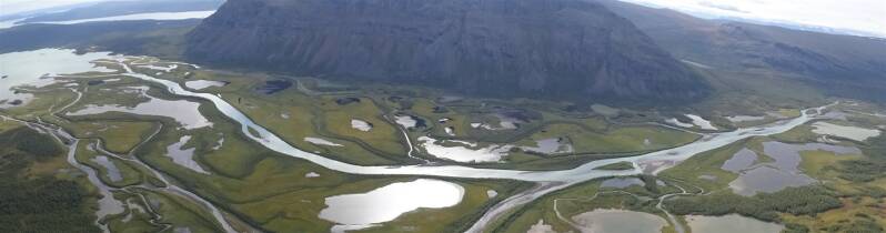 Rain is softly tapping my outer tent. My thermarest sleeping mat has delaminated partially during the night, causing a large pocket of air to collect at the bottom. Fortunately the largest part is still usable and together with my inflatable pillow I can still stretch out decently. I turn over. When the rain appears to lessen, I force myself to get up. I pack my things and cross the river, across the iron wobbly bridge which sings with every step. The trail to the fjÄllstuga is steep, but short. From the plateau I have an amazing view of the elongated lake, Alisjávri, and the Sami-village on the other shore. I descend to a muddy path along the shore, with boardwalks here and there. I catch up to Laura, who has camped next to the lake and is slowly getting started with stiff feet. There’s low shrub, which saturates my pants, that had stayed dry up till then. René passes us and disappears in the distance. It starts to drizzle again. Streams and rivers are flowing down from the mountains. Sometimes there’s a bridge, but we also get to hop across from stone to stone. After five kilometers there’s a boathouse, a covered shelter where in the busy season hikers who want to skip a few kilometers can take a boat to Alesjaurestugorna. We shelter against the rain, which doesn’t worsen, but is persistent. We snack and lunch and Laura bushwhacks to the slanted latrine without a door a ways off, but eventually opts for the shrubs. We start hiking again. I am wearing almost all my clothes, except my sleeping outfit and put on my rain pants for the first time. Snugly bundled up the rain doesn’t matter. Via a small passage the Alisjávri flows into the Rádujávri. The mountains in the background are misty, but no less spectacular. Still hikers come towards us, even though not as many as yesterday. Slowly the trail turns away from the water. There’s a reindeer fence, which we conquer with sturdy steps. Then we trek into the valley Gárddenvággi, in between 1154 meter high Gárddenvárri and 1461 meter high Šiellanjunni, whose top is covered by clouds. There’s a short stretch with rocks and I progress slowly. Across a narrow ridge I descent to the waters of the Siellajokha, which I can hear raring already. Just on the other side of the river there are some bivouacs, the last place prior to Abisko National Park where wild camping is allowed. There are not many tents, but the latrine smells disgusting and is filled with trash and along a side trail too dozens of pieces of toilet paper are decomposing. I even discover some diapers underneath a rock. Juck! I put my tent next to René’s and we make plans for our last day of hiking. Laura hikes on to Abiskojaurestugorna, because she wants to arrive in Abisko around noon. With 16 kilometers I will not manage that early, but that I will arrive there tomorrow is certain.