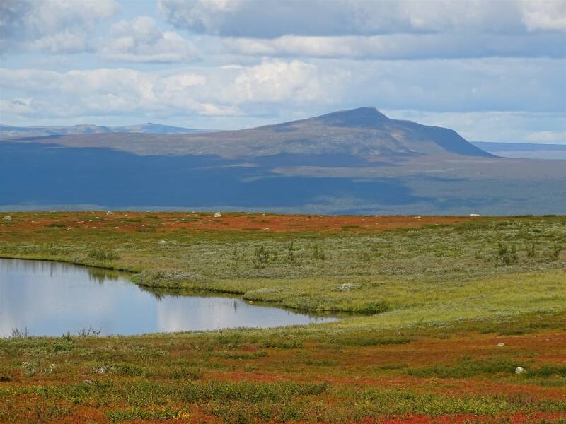 Halfway across the mountains there’s a kata, a traditional Sami shelter. A frame of branches, clad with moss and a dirt floor. The holes in the roof, meant to let the smoke from the fire escape, have been patched with plastic. It reminds me of the sod huts made of peat in Drenthe province. Dark and unattractive. Only in dire need I would stay here. I hike on and the landscape remains gorgeous. Lakes, rocks, fall colors. This is a landscape which brings me joy. I see hikers looking for bivouacs and pitching their tents, but hike a little further. Preferably I pitch my tent next to a river or stream and here there are only lakes. When I descend through birch forest, I surprise a reindeer, which quickly flees. Again the soil is very wet, the trail goes straight through a swamp. The peat bounces underneath my feet and hikers have made wide tracks, like a herd of reindeer having a dancing party. I start looking for a bivouac, but for kilometers the forest is to soggy to think of camping. Through a thin strip of forest I see the water of a lake, but along the shore there’s big rocks and the ground slopes. My feet are tired and I have little eye for nature’s beauty now. Not until the bridges across Sálvojåhkå river I discover two bivouacs. I quickly pitch my tent and prepare some pasta, with the fish I have brought along as a treat for hard days. Morten surprises me by passing by, I had expected him to stop earlier. He complains he’s tired and hikes on.