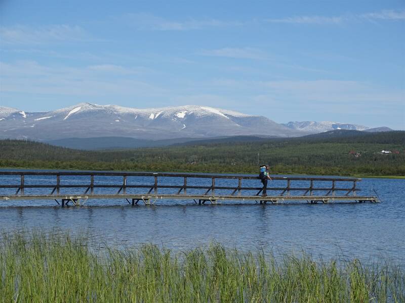 We are grateful for the morning sun and hang out our tent to dry on the bridge. By the time I have had breakfast and am ready for another day of hiking, both the outer tent and the groundsheet are dry. I am the first to head out through low forest. The trail is easy, without rocks and roots and I am making decent progress. The trail takes me across some hills, lying like folds in the landscape between me and the water. Now and again there’s a lakelet and there are boardwalks, but it’s never hard. I encounter various beautiful bivouacs and Niels emerges from one of them, a Dutch young man I apparently already met in Jäkkvik, although I do not remember him. He’s faster than me, but takes a break in the sun after an hour. I have a serious case of get-there-it is and hike on. Only at the last descent to Sakkat, the lake we have to cross, the trail becomes a bit more challenging. Fortunately that mostly affects the sobo’s, who are having to climb hard and steeply. For me it is just as steep, but at least I am going down. A first stream I cross via stepping stones. A second one is not directly on the route, but the waterfall sounds so impressive I gladly hike towards it through the shrubs. When I am standing next to the roaring waterfall, a branch of foliage keeps me from viewing the waterfall fully. Fortunately there are plenty of rocks and carefully I scramble into the stream for a better picture. Then I scratch my head. Going back down to where I came from is not the safest option across those wet and slick rocks. I climb a bit higher still and step safely back onto the shore. On then, ever descending and my impatience increases. The winter trail, which I had missed for a while now, joins the trail. Some final boardwalks and I see Mallenjarka, the unmanned hut on the shores of Sakkat. I walk to the water and have a fantastic view of the lake, the wooden jetty and the mountains behind. This is a perfect picture postcard. It’s still a two hour wait for the boat and I use the time to wash my pants, which are already covered with mud up to the knees after only two days. I also dangle my feet in the freezing water for a while before allowing them to warm up again in the sun. Niels and Morten joint me and we talk about our plans for the coming days. Morten will quit his hike in Kvikkjokk. He’s still convinced he could hike the PCT easily, but has adjusted his priorities. He also thinks Sweden should be ashamed about such a poorly maintained trail like the Kungsleden. I, of course, have a different opinion on that matter, but think he chose wisely by stopping. This is a trail for enthusiasts, people who love hiking and for whom the love for nature is greater than their desire for comfort and dry feet. Who constantly complains, might be better off staying home.