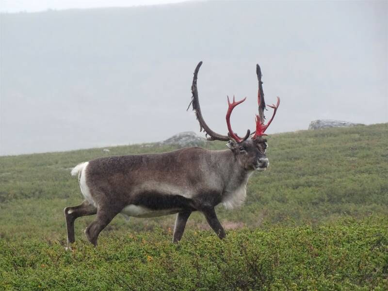 For a long time I’m wavering, a zero day or go hiking? It’s dry, but the past few days I’ve been misled a few times already. Eventually I decide its too nice to stay inside. I hoist my backpack up and hike back to the parking lot at the edge of the river. A bridge and a bit later I am standing at the other end of Ammarnäs. I cross the road to a pine forest and at a second road I hike past a sign ‘no snowmobiles allowed’. There I no longer see any way markers. Back then and at the tarmac I discover modest orange dots. I follow them up towards the bottom of a ski slope. Through the forest at the edge of the slope I hike upwards. It’s fairly steep, this is not what the elevation profile looked like. Halfway up the slope I meet the German woman Zilke and the Danish Morten. Lightning fast Dutch Bart joins us and we take pictures of each other with Ammarnäs and it’s grandiose lakes in the background. Past the ski station the trail continues on a track and it takes a long time before we reach the tree line. Then we have an amazing view of the mountains and reindeer parade in front of us nicely. A bull has bloody strips of skin hanging from it’s antlers, a sign the rut is not far off anymore. There’s a lot of wind and I feel a blush on my cheeks. Nice! The mountains show a different face again and again and it never gets boring. When I descend, I discover a waterfall on a distant mountain slope, where I suspect Rävfallsstugan will be. This time the trail heads fairly straight towards the waterfall, but the last stretch especially there’s a fair bit of birch forest. My feet are letting me know they have had enough for today. Then I reach Vindelälven with it’s angry rapids. Just on the other side of the bridge in the forest there are some gorgeous bivouacs. I pitch my tent and only visit the unmanned hut for the latrine and the nifty hose spouting deliciously fresh river water.