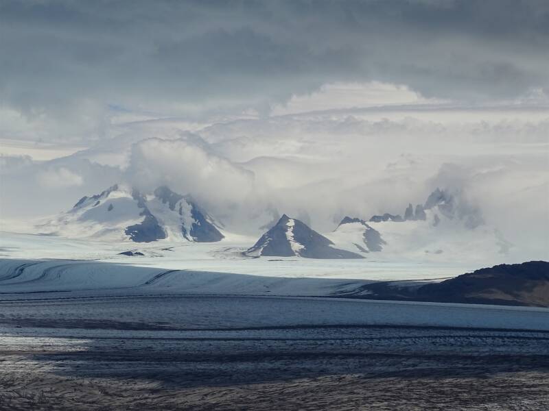 's Ochtends vroeg hoor ik de wind om mijn tent razen. Dat belooft niet veel goeds. Ik ga vroeg op pad om de verwachte rij bij de tyrolean traverse voor te zijn, maar daarover had ik me geen zorgen hoeven te maken. Op twee wandelaars voor me na, ben ik alleen. Ik loop stroomopwaarts langs de rivier tot het een meer wordt, onderwijl de wind trotserend. In Nederland had deze storm het nieuws gehaald met omgevallen bomen en afgewaaide daken. Hier kan ik me alleen schrapzetten met mijn trekking poles en proberen overeind te blijven tot de ergste windvlaag voorbij is. Ik volg het pad tot aan de rotsen en daar, bij een kleine waterval, raak ik het kwijt. Ik zie op de onderaan de rotsen wel cairns, maar die zijn voor de mensen die de rivier willen doorwaden, wat de ranger heeft afgeraden met deze waterstanden. Ik besluit te wachten op de volgende wandelaars, de drie Amerikaanse klimsters en sluit me bij hen aan. Zij kiezen zonder aarzelen een weg omhoog langs de waterval en over de rotsen, langs schaarse cairns. De wind is hier gelukkig minder en dat scheelt enorm. Uiteindelijk komen we bij een nauwe kloof vol kolkend, grijs water, waar een ijzeren kabel over is gespannen. Een vriendelijke man helpt me mijn klimharnas te ontwarren en een van de Amerikaansen heeft op me gewacht en helpt me op de juist manier aan te haken. Aluminium karabiner aan de katrol, ijzeren rechtstreeks aan de kabel. Hoewel ze hun rugzak zelf omhielden, hang ik hem netjes aan de ijzeren karabiner, mijn trekking poles en tentstokken in de zijvakken, maar met kleine clips vastgemaakt aan de rugzak zelf. En bijna voor ik er erg in heb, hang ik in het harnas en trek mezelf langs de kabel voort, onder luide aanmoedigingen van de Amerikaansen, Anne, Susan en Briand. Je kunt veel over Amerikanen zeggen, maar het voelt toch oprecht goed om zulke cheerleaders te hebben. Het begin gaat aardig makkelijk, maar dan gaat het omhoog en wordt het zwaarder. Kon ik eerst hand over hand pakken, uiteindelijk heb ik beide handen nodig om een stukje vooruit te komen. Wanneer ik het bijna niet meer trek, vinden mijn voeten houvast op de rotsen. Het laatste stukje gaat zo een stuk makkelijker. Afhaken moet ook volgens een heel protocol, waar Briand, die al eerder overging, me gelukkig mee helpt. Pas als ik helemaal stabiel ben, mogen de karabiner los en kan ik het harnas weer inpakken. Ik kijk nog even hoe twee andere wandelaars oversteken en vervolg dan het pad. In de verkeerde richting. Dat zie ik pas als het meer weer zichtbaar wordt, vlagen water nog steeds richting de bergen waaiend. Dit is het pad voor mensen die de rivier hebben doorwaad. Oeps! Ik loop inmiddels met drie andere wandelaars, waaronder de Duitse Julio en samen lopen we terug. Na enig zoeken vinden we het juiste pad en de twee andere wandelaars verdwijnen al snel uit zicht. De route klimt gestaag, maar niet heel steil. Algauw verschijnt de eerste gletsjer die de rivier voedt, glaciar Rio Tunel inferior, de onderste Rio Tunel gletsjer. Het pad loopt over de morene er hoog boven, bergen grijs grind met het pad net een tintje lichter dan de rest. Ik zie een aantal mensen op de gletsjer lopen, maar vanwege de enorme gletsjerspleten ben ik daar niet happig op. Ik volg een spoor, maar daal uiteindelijk toch af naar de gletsjer. Aan de rand stroomt helder water en ik drink een paar slokken heerlijk koel water. Nu ik het zo van dichtbij bekijk, voelt de gletsjer best veilig om op te lopen en het gaat zeker een stuk makkelijker dan de morene. Er liggen stenen en gruis op het ijs en crampons zijn niet nodig. Ik kom geen grote spleten meer tegen, wel mooie vormen en een hele diepe waterval, waarvan ik de bodem niet kan zien. Ik dacht dat het ijs hier dun zou zijn, met een solide rotsbodem er vlak onder, maar zo te zien is de gletsjer zelfs aan de rand tientallen meters dik, zo niet meer. Uiteindelijk moet ik de gletsjer weer verlaten en aan de sporen op de morene zie ik waar andere wandelaars dat hebben gedaan. Julio loopt voor me als een levend baken en ik richt me op zijn positie. Maar weer terug op de morene komen is nog niet zo makkelijk. Tot mijn grote verbazing bestaat de morene uit ijs met een dun laagje gruis erover en als ik omhoog wil, glijd ik steeds weg. Net iets hoger zie ik grotere stenen die meer houvast zouden moeten bieden en ik speur naar een manier om daar te komen. Kruipend, dat staat sowieso vast, van lopen is geen sprake meer. Uiteindelijk lukt het me op handen en knieën en dan nog met grote moeite en diverse blauwe plekken her en der. Eenmaal stabiel reik ik met mijn trekking pole naar Julio en trek hem omhoog naar vaste grond. Vandaar wordt het pad makkelijker, een grijs lint over de toppen van de morene. We laten de eerste gletsjer achter en lopen naar de tweede, glaciar Rio Tunel superior, de bovenste Rio Tunel gletsjer. Aan de voet van deze gletsjer ontspringt de rivier, maar de gletsjer zelf is minstens zo indrukwekkend, met cerro Azara op de achtergrond. Ter hoogte van de gletsjer, raak ik het pad bij een rand weer kwijt, waarschijnlijk omdat ik omlaag kijk en niet omhoog. We moeten tenslotte naar de pas. Julio pakt zijn gps erbij en een stukje terug vinden we een tweede pad omhoog. Lang, lang omhoog. Het is niet heel steil, wel zwaar. Bij een rots pauzeer ik even om op adem te komen. Julio en een groepje andere wandelaars lopen door. Er is een hoog pad en een lager pad en iedereen kiest voor het lagere. Niet lang daarna volg ik ze, maar waar de twee paden weer vlak bij elkaar komen, klim ik dwars over een steenhelling omhoog naar het makkelijker ogende hogere pad. Dat gaat vrij eenvoudig naar de 1.410 meter hoge Paso del Viento en van hier kan ik de pas zien. Dat geeft me de energie die ik nodig heb en ik zet door om de laatste meters te bedwingen. Na een korte pauze daal ik iets af langs twee meren naar een uitzichtpunt. En wat een uitzicht! Een zee, een oceaan van ijs, zich uitstrekkend tot de horizon. Het Zuidelijk Patagonisch IJsveld. Verre bergen steke