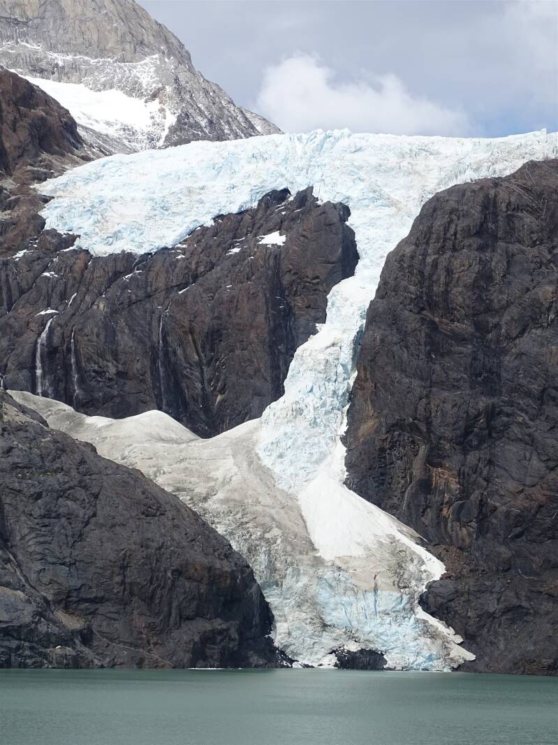 Ik laat de drukte van Grey achter me en ga rond 08.00 uur op pad. Ik ben nog niet helemaal bijgekomen van gisteren en besluit het rustig aan te doen. De route is makkelijk, weinig rotsen en veel grind. Als ik moet klimmen, gaat dat rustig met kalme zigzaggen. Er is veel dood bos hier, de bomen vertonen sporen van brand. Er zijn meerdere bosbranden geweest in Torres Del Paine, een slecht uitgemaakte sigaret, een gasbrander die omviel, iemand die toiletpapier probeerde te verbranden. Vandaar dat roken en open vuur in het nationaal park nu ten strengste verboden is. De boete kan oplopen tot twee miljoen pesos en maximaal drie jaar celstraf. Terugkijkend zie ik een regenboog boven de gletsjer. Eerst wat vaag, maar later groter en helderder. Ik blijf foto's maken, want hoe hoger ik kom, hoe mooier het uitzicht. Het perspectief verandert telkens, de regenboog net even anders over de bergen gedrapeerd en het blijft fascinerend mooi. In het water drijven een paar diepblauwe ijsbergen en hoewel het pad er hoog boven blijft, kan ik ze met mijn zoomlens dichtbij genoeg halen om de bijzondere vormen te zien die het water heeft uitgesleten. Eenmaal boven de boomgrens is het niet koud. De wind is stevig, maar warm en ik loop voor het eerst in T-shirt. Wel smeer ik me goed in. In elke refugio wordt het dagelijkse UV-stralingsrisico vermeld en die is hier onverminderd hoog. Minder dan factor 50 verkopen ze dan ook niet. Er zijn nu meer dagjesmensen met lichte rugzakken of zelfs een enkel flesje water, maar het zijn nog steeds geen pretparktoestanden. We passeren elkaar en ik ben weer alleen. Met zoveel uitzichtpunten kom ik maar langzaam vooruit. Telkens verleidt weer een nieuw zijpaadje me tot een laatste blik op de gletsjer, tot die definitief achter de heuvels verdwijnt. De laatste drie km naar Paine Grande zijn gelukkig redelijk vlak door een smalle vallei. Het is een enorme hut, met een terras, groot restaurant en talloze wandelaars die komen en gaan. Het water van Lagos Pehoe dat zich voor de hut uitstrekt is zo blauw dat je het niet zou geloven als je het op tv zag. Op de overdekte veranda doe ik mijn schoenen uit en strek me uit op een gammele bank. Mijn zitmatje leg ik onder mijn gemangeld voeten voor net dat beetje extra comfort. Ik loop in Nederland al aantal jaar op trailrunners en mijn nieuwe bergschoenen missen de demping die ik gewend ben. Na een uurtje rust loop ik verder en zie dan pas wat me op de heenweg niet was opgevallen. Een keten ruige pieken, zwart aan de top maar een dikke, witte band eronder. Hoe zou dat komen? Het pad is vanhier erg makkelijk, redelijk vlak en weinig rotsen. Zo her en der hebben rangers sluippaadjes afgesloten met takken en boomstronken en het lijkt erop dat de route naar refugio Italiano zelfs een heel stuk is omgelegd voor natuurherstel. Op een afgesloten pad staan de vertrouwde rode paaltjes, maar ik volg het hoofdpad dat kalmpjes naar de mysterieuze pieken slingert. Over een heuvel verschijnt Lago Skottsberg en hoewel ik wat watervogels verwacht, blijft het meer leeg. Wel scheert er kort een condor langs, maar die verdwijnt geluidloos en zonder ook maar een vleugelslag weer uit het zicht. Het uitzicht op de pieken wordt mooier en mooier en ze komen ook dichterbij. Er stromen veel beekjes over het pad, maar deze zijn niet diep genoeg om me zorgen te baren met mijn hoge bergschoenen. Uiteindelijk beginnen mijn voeten weer te tintelen en ik kijk ernaar uit bij Italiano lekker op de veranda te zitten met een colaatje. Maar daar kom ik bedrogen uit. Het is wel een ranger station, maar geen refugio. Behalve water is er niets te krijgen. Het is er wel druk met wandelaars die vanhier de wandeling maken naar Mirador del Frances of Brittanico. Ik had deze ook op mijn verlanglijstje staan, maar na gisteren heb ik geen energie voor nog eens een zware wandeling van zes uur extra, zelfs met alleen een dagrugzak. Met 19 km is dit ook best weer een lange dag. Op een groot houten platform strek ik me uit in de zon. Even een half uurtje luieren. Volgens de handwijzer is het van hier nog maar twee km naar camping Frances, maar de afstanden op de borden en handwijzers kloppen voor geen meter, heb ik al door. Al na een km op de GPS zie ik het bord dat de camping aankondigt. Die ligt vrij ongunstig op een steile, beboste berghelling en ik zet mijn tent op een van de houten platformen op. De haringen leg ik plat en ik pin ze vast onder zware rotsblokken. Het ziet er niet fraai uit en het tentdoek staat niet heel strak, maar het werkt.