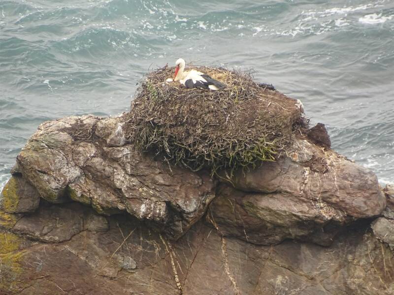 Dichte mist verbergt de horizon. Toch smeer ik me alvast in en ga gewoon in T-shirt op pad. Ik volg eerst een lus om het dorp heen, die je volgens de wandelgids ook gewoon kunt overslaan. Maar het is een leuke lus met smalle groene paadjes die me naar het strand brengt. Daar loop ik verkeerd, afgeleid door het mooie uitzicht. Ik volg de kliffen over het strand en langs getijdepoelen en over stenen tot er echt geen doorkomen meer aan is. Terug dan maar en zoals ik al had verwacht moet ik omhoog, de klif op. Na een steil klimmetje ben ik boven en wordt het vlak. Ik loop over het zand naar een weg en volg dan een zandweg langs de oceaan. Op de rotsen staan vissers en een draagt een plastic ton vol kleine visjes mee. Het loopt lekker vlot zo over die weg en voor het eerst zit ik in een bubbel, met wandelaars voor en achter me. De route draait het binnenland in, waar er waarachtig een dennenbos is. Daarna weer terug naar de zandweg. Het uitzicht op de oceaan is prachtig en ik zie ooievaars op onmogelijke plekken broeden. Af en toe zijn er paden vol mul zand waar het even ploegen is, maar het blijft genieten. Ik doorkruis het gehuchtje Cavaleiro terwijl ik oploop met een Nederlands echtpaar dat een dagwandeling maakt. Na een pad tussen een muur van hoge struiken komen we weer bij het strand uit, waar vanachter een laag wit gebouw een kleine vuurtoren prijkt. Het is de vuurtoren van Cabo Sardão en het is apart dat de vuurtoren zich achter het gebouw bevindt en niet ervoor, zoals andere Portugese vuurtorens. Sommigen denken daarom dat de bouwer de plannen per ongeluk 180 graden heeft gedraaid. Op een bankje bij een uitkijkpunt houd ik even rust in de zon en smeer me opnieuw in. Daarna ga ik weer verder, vlak langs de rand van de kliffen en indrukwekkende rotspartijen. Het water is ongelooflijk helder en ik kan de bodem zien. Een klif steekt uit in de oceaan en vormt een doorgezakte triomfboog. Het lijkt een kwestie van tijd voor de rots doormidden breekt en twee pilaren vormt. Vanaf de route loopt een klein paadje naar een rotspunt en als ik het volg, zie ik iets lager twee ooievaars broeden. Ik houd afstand om ze niet te verstoren, maar kan dichtbij genoeg komen voor een fraaie foto. Na nog weer een stuk zandweg langs een prachtig bloemenveld waarin twee ooievaars rondstappen op zoek naar eten, daal ik af over een houten trap. Ik kom uit bij een vissershaven waar krabfuiken hoog liggen opgetast op een betonnen boothelling. Ik klim omhoog naar het gehuchtje Entrada da Barca waar ik aan de waddeneilanden moet denken. Net als de jutters daar versieren de vissers hun huizen met talloze oude boeien en stootkussens. Nog steeds aangenaam lui rust ik kort in de schaduw van een picknickplaats met afdak. Dan volgt er een lang stuk langs een weg met vers asfalt. Het straalt warmte uit en ik voel me draaierig worden, terwijl ik toch genoeg heb gegeten en gedronken vandaag. Gelukkig mag ik voor het laatste stuk over een houten plankier weer even de duinen in en de duinen vervelen nooit. Bij een tweede plankier draai ik het dorp in waar hostel Nature het beste hostel is dat ik op de Rota Vicentina ben tegengekomen.