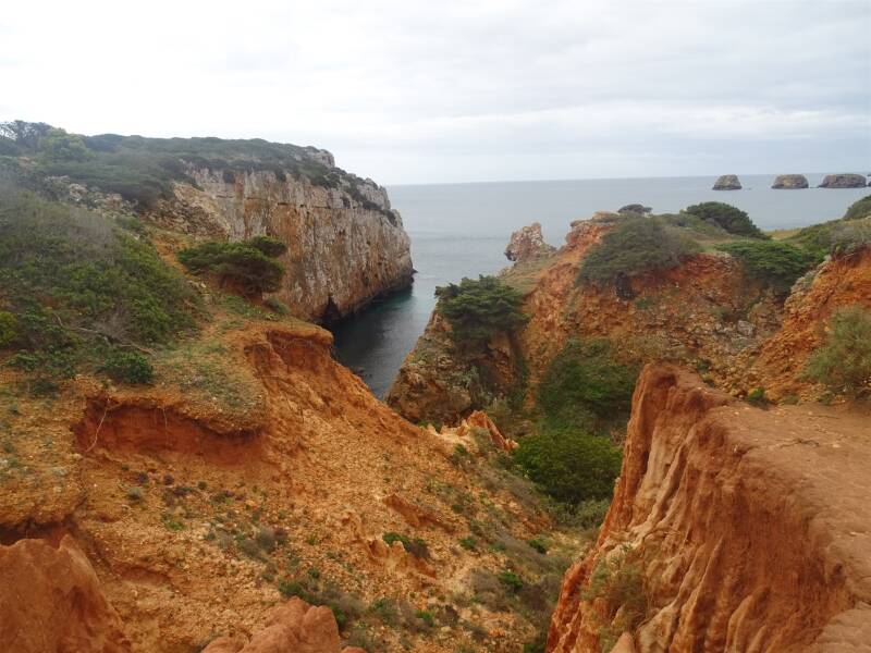 Vanaf de bushalte aan de hoofdweg ver buiten het dorp loop ik terug naar de Fisherman’s Trail. Het regent al de hele ochtend en schuilend onder mijn paraplu eet ik een verlaat ontbijt. Langs het strand waar de vissersbootjes wachten op bemanning ga ik op stap. Een aar huizen verder geeft een man een aantal katten eten. Het lijken geen zwerfkatten te zijn, maar ik heb al meer gezien dat ze toch eten krijgen van dierenliefhebbers. Ik ga verder door de smalle straatjes van het dorp. Voor het eerst kom ik twee sierlijke Mariakapellen tegen, een grote en een kleinere, pal naast elkaar. Buiten het dorp is er een heuvel te beklimmen, maar de paden zijn vandaag makkelijker. Ik hoef nergens te klauteren, al vergt het stijgen nog wel het nodige van mijn kuiten. De route slingert over kliffen. Bij Burgoa voel ik klei onder mijn schoenen en hebben de kliffen bijzondere kleuren, rood, groen, grijs. Heel bijzonder. Tussen de huizen zijn er smalle trappetjes omlaag naar het strand. Daar peuzel ik de laatste kaas op, die na bijna twee weken ook echt op moet. Als ik verder loop zijn de huizen nooit ver weg. Er komt en donker dreigende lucht aan en ik hoop op tijd een restaurant in te kunnen duiken. Maar nee, op het moment dat de hoosbui losbarst ben ik in een paar tellen doorweekt. De kliffen zijn door de regen een vaagblauwe sluier. In Luz duik ik alsnog een bar in voor de lunch en om wat op te drogen. Dat gaat lang goed en de route blijft geweldig. Pas vlak voor Lagos gaan de hemelsluizen echt helemaal open en houdt het ook niet meer op met regenen. De wind maakt het lastig om vanonder mijn paraplu foto's te maken en juist hier is het mooi, met rotsen in zee die een boog vormen, van onderen uitgehold door het water. Er zijn plankieren naar uitzichtpunten, maar het is geen pretje daar te verblijven. Ik loop op een laag gebouwtje af met een kleine vuurtoren erop. Dan doorkruis ik de stad op weg naar het eindpunt. Bij de haven is een fort dat er mooi uitziet, maar ik ben te gierig om de 2,- entree te betalen. Ik volg het kanaal over een brede boulavard, waar talloze stalletjes zijn van rondvaartboten en andere toeristische uitstapjes. Ze zijn leeg, vandaag worden er geen tickets verkocht. Ik steek een brug over naar het station, waar het officiele eindpunt van de trail is. Zonder al te veel ceremonie is het voorbij.